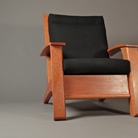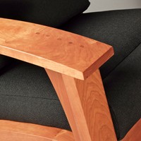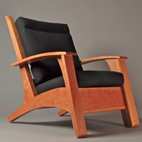 My attempt to create a somewhat more sophisticated and modern adirondack chair, constructed from cherry. Thanks to Allied Upholstery in Sacramento for the nice upholstery.