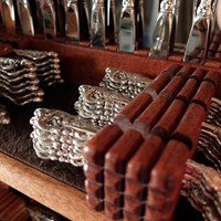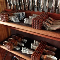 Cabinet for storing sterling silverware. I based much of the design on a cabinet made for the model office in a vocational school in 1912 designed by Bela Lajta. I was drawn to the Hungarian folk symbols carved in the door, the fluted shape of the legs, and the unusual bottom side rails. The interior design of the original Lajta cabinet is unknown but I attempted to make it harmonious with the exterior. The cabinet is made of African Mahogany with crotch mahogany veneer on the fold down table. The interior shelfs feature anti tarnish silver cloth on the shelves.