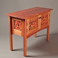 Cabinet with panels made up from hand-dyed leaves individually glued into three layers to create an open look and faciliate air movement. Cabinet is also open-backed for ease of access and air movement. The cabinet is constructed from cherry (figured for the top). Individual leaves are made from tulip poplar and modeled from actual quaking aspen leaves.