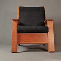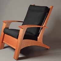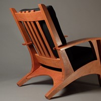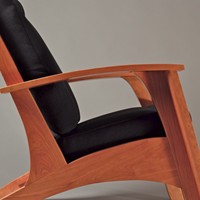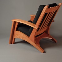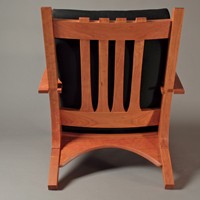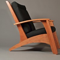 My attempt to create a somewhat more sophisticated and modern adirondack chair, constructed from cherry. Thanks to Allied Upholstery in Sacramento for the nice upholstery.