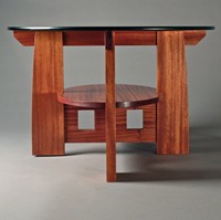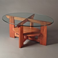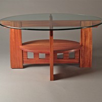 Coffee table based on a scaled down Limbert #158 double-oval library table. Constructed of African Mahogany and Sapele with a glass oval top.