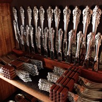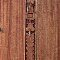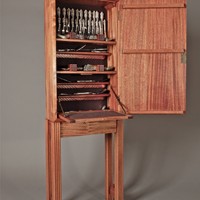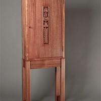 Cabinet for storing sterling silverware. I based much of the design on a cabinet made for the model office in a vocational school in 1912 designed by Bela Lajta. I was drawn to the Hungarian folk symbols carved in the door, the fluted shape of the legs, and the unusual bottom side rails. The interior design of the original Lajta cabinet is unknown but I attempted to make it harmonious with the exterior. The cabinet is made of African Mahogany with crotch mahogany veneer on the fold down table. The interior shelfs feature anti tarnish silver cloth on the shelves.