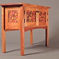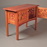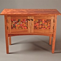 Cabinet with panels made up from hand-dyed leaves individually glued into three layers to create an open look and faciliate air movement. Cabinet is also open-backed for ease of access and air movement. The cabinet is constructed from cherry (figured for the top). Individual leaves are made from tulip poplar and modeled from actual quaking aspen leaves.